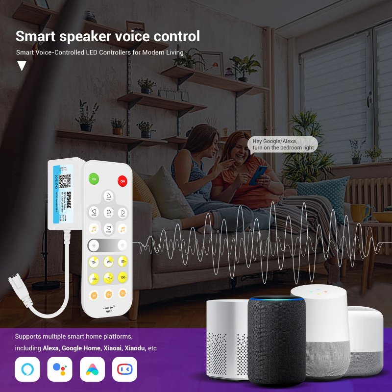 کنترل صدا از طریق بلندگوهای هوشمند: با پلتفرمهای بلندگوی هوشمند مانند Alexa، Google Home، XiaoDu و XiaoAi یکپارچه شده است که امکان کنترل روشن/خاموش روشنایی، روشنایی و رنگ را از طریق دستورات صوتی فراهم میکند.