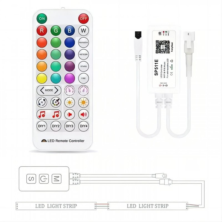 کنترلر حرفه ای دیجیتال SP511E وای فای با ریموت 38 کلید IR و نرم افزار اندروید و IOS که با وای فای به نرم افزار متصل می شود یک کنترلر رویایی برای نوار LED، ریسه LED، پیکسل LED و غیره است.این کنترلر با قیمت اقتصادی و کیفیت مناسب ، نورپردازی زیبایی را برای فضای دلخواه شما به ارمغان می آورد.