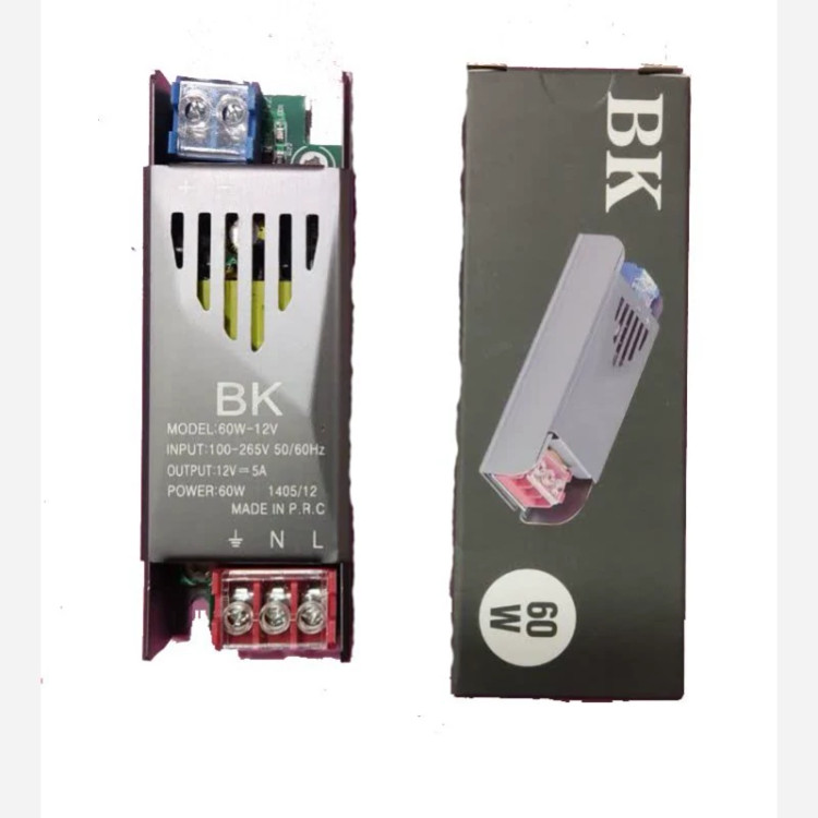 این سوئیچینگ ها از بهترین برندهای موجود در بازار ایران میباشد. با توجه به قیمت مناسب خود دارای راندمان بالایی هستند. محصولات این برند به خوبی مصارف صنعتی و خانگی را پوشش می دهند. سوییچینگ 12 ولت 5 آمپر اسلیم BK سوییچینگ 12 ولت 60 وات (5 آمپر) اسلیم یا باریک با ابعاد طول 102 میلیمتر، عرض 35 میلیمتر و ارتفاع 23 میلیمتر میباشد. این محصول دارای ترانسفورمر تمام مس با قابلیت قطع در صورت اتصال کوتاه و اوورلود ولتاژ و اوورلود جریان است.