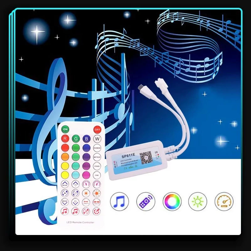 کنترلر دیجیتال موزیکال SP611E دو خروجی یک کنترلر LED است که برای کنترل نوارهای LED، ریسه های LED، پیکسل های LED و غیره استفاده می شود. این یک کنترلر دیجیتال بلوتوثی است که می تواند با استفاده از یک برنامه تلفن هوشمند یا تبلت کنترل شود. کنترلر حرفه ای دیجیتال SP611E بلوتوثی با ریموت 38 کلید IR و نرم افزار اندروید و IOS که با بلوتوث به نرم افزار متصل می شود.ریموت کنترلر SP611E بلوتوثی موزیکال با قیمت اقتصادی و کیفیت مناسب ، نورپردازی زیبایی را برای فضای دلخواه شما به ارمغان می آورد. ریموت کنترلر SP611E بلوتوثی موزیکال یک کنترلر دیجیتال برای نوارهای LED RGB است که از طریق بلوتوث و مادون قرمز قابل کنترل است. این ریموت دارای میکروفون داخلی و خارجی برای همگام سازی نور با موسیقی است و همچنین دارای 142 افکت پویا و 18 افکت موسیقی است.این کنترلر دیجیتال توانایی راه اندازی دو ریسه ال ای دی به صورت همزمان را دارا می باشد.