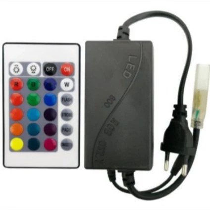 دستگاه کنترل کننده ریسه های RGB LED جهت کنترل کامل ریسه های شلنگی 220 ولت 4 سیم رنگی برش یک متر کاربرد دارد. روشن و خاموش و تغییر رنگ ال ای دی و الگوی رقص نور نیز توسط همین کنترلر با 24 دکمه انجام می شود . ولتاژ این محصول 220 ولت و توان آن 1000 وات است.