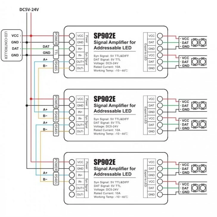 این محصول یک تقویت کننده سیگنال دیجیتال SPI و RS485 برای حل صحیح مشکلات سیم کشی پیکسل نواری led آدرس پذیر 3 پین WS2812B/WS2811 است.